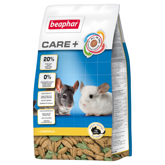 Beaphar CARE+ Chinchilla is a tasty, complete and well-balanced food specially formulated for Chinchillas. These hardened pellets help keep your pets teeth in good shape. High temperature treatment improves protein digestibility. Made with echinacea and spirulina to help support disease resistance and FOS to encourage the growth of beneficial gut bacteria, and MOS to remove bad bacteria and expels them in the faeces. There is even a handy re-sealable tab to keep it fresher for longer when opened.