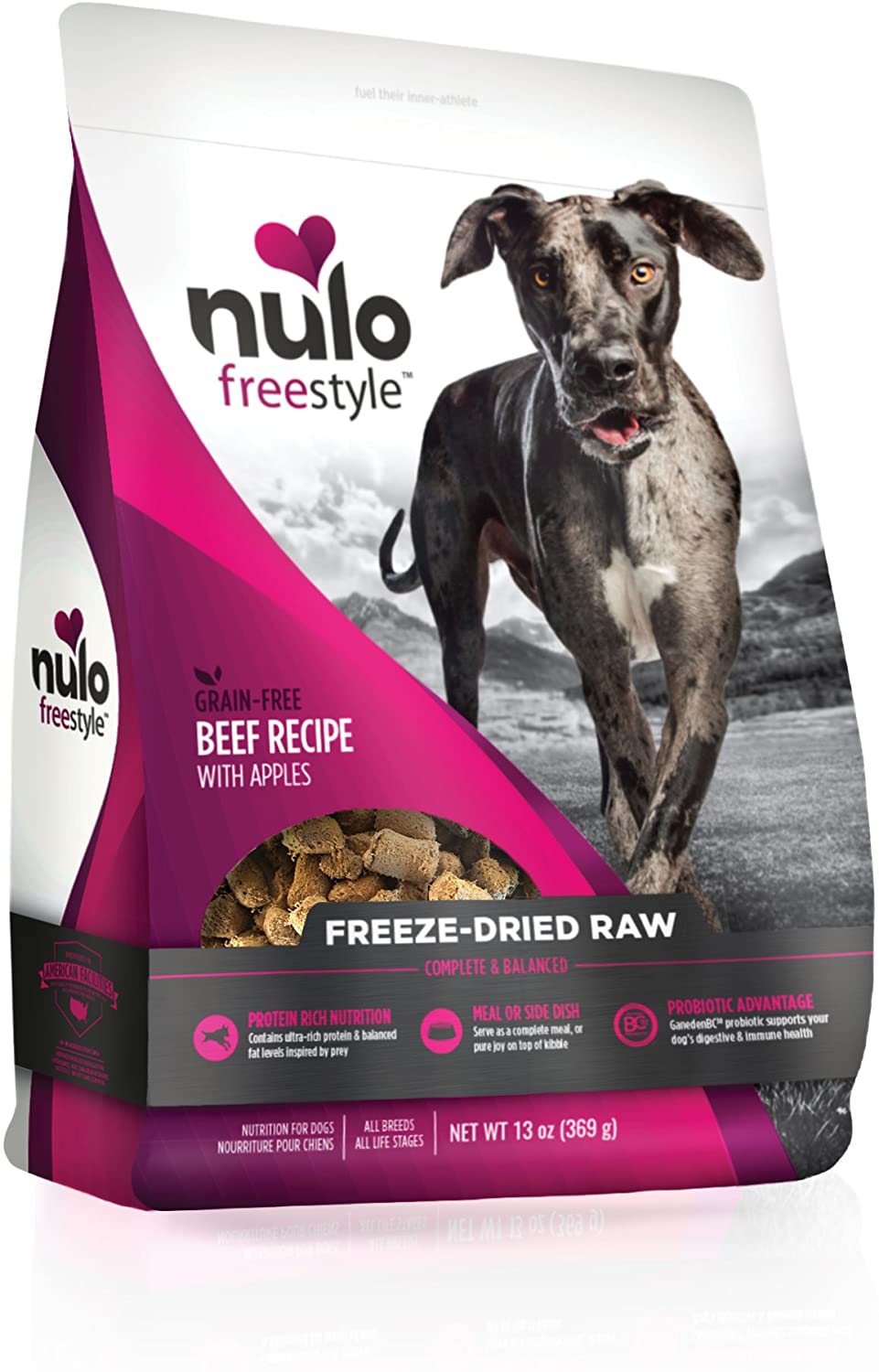 Give your pooch the raw, prey-inspired nutrition he thrives on with the Nulo Freestyle Grain-Free Beef Recipe With Apples Freeze-Dried Raw Dog Food. It¡¯s all the benefits of raw without the hassle, containing 83% beef, organs and bone for the ultra-rich protein and balanced fat your pal needs to feel and look his best, plus fruits and veggies like broccoli, parsley, and apple. It also has GanedenBC30, a powerful probiotic, or ¡°good bacteria¡± that supports your dog's digestive and immune health with every bite. These irresistible morsels are minimally-processed and quickly frozen to lock in the most nutrients and flavors. Plus, it¡¯s made with no corn, wheat, soy, artificial preservatives, colors or flavorings.