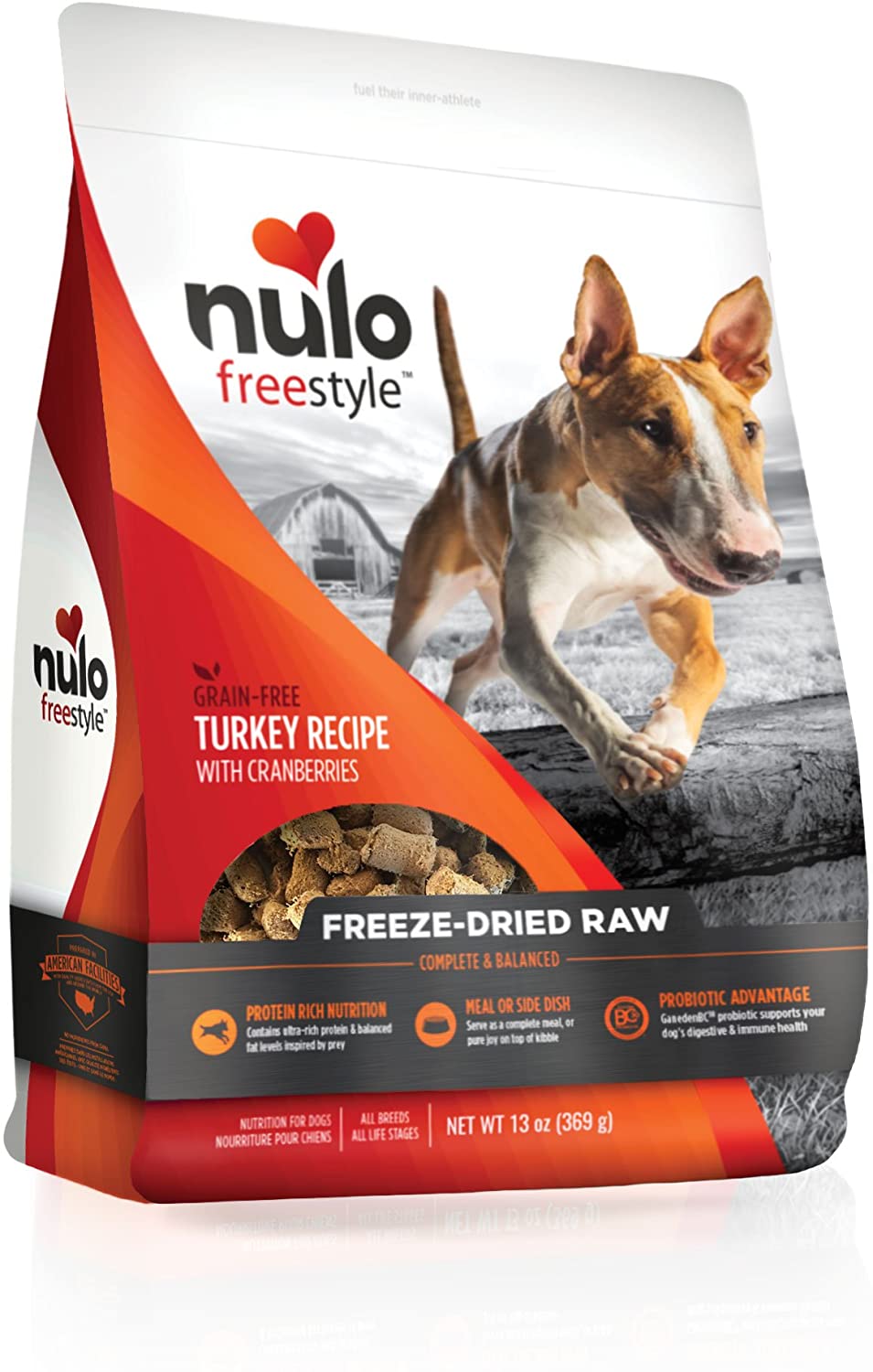Give your pooch the raw, prey-inspired nutrition he thrives on with theNulo Freestyle Grain-Free Turkey Recipe With Cranberries Freeze-Dried Raw Dog Food. It¡¯s all the benefits of raw without the hassle, containing 82% turkey, organs and bone for the ultra-rich protein and balanced fat your pal needs to feel and look his best, plus wholesome cranberries. It also has GanedenBC30, a powerful probiotic, or ¡°good bacteria¡± that supports your dog's digestive and immune health with every bite. These irresistible morsels are minimally-processed and quickly frozen to lock in the most nutrients and flavors. Plus, it¡¯s made with no corn, wheat, soy, artificial preservatives, colors or flavorings.