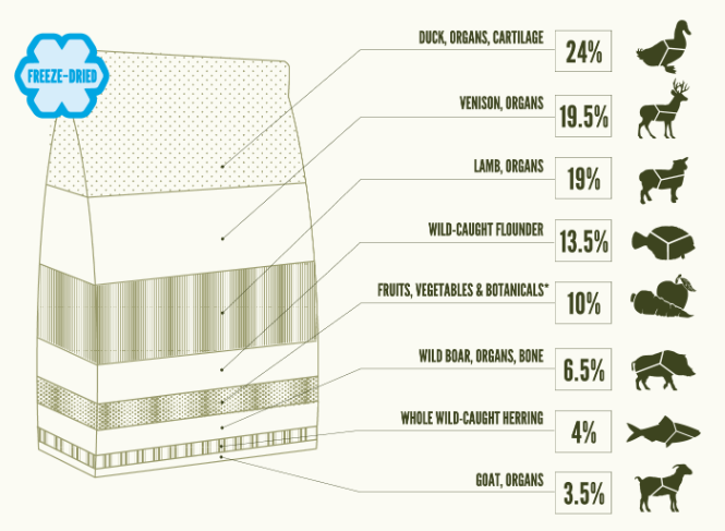 Venison, duck (ground with bone), flounder, lamb meat, duck liver, herring, lamb liver, wild boar liver, wild boar, goat meat, pea fiber, whole pumpkin, collard greens, carrots, apples, wild boar bone, lamb kidney, lamb tripe, wild boar heart, goat liver, goat tripe, goat kidney, duck heart, dried help, zinc proteinate, potassium chloride, manganese proteinate, copper proteinate, calcium pantothenate, vitamin E supplement, mixed tocopherols (preservative).Guaranteed Analysis