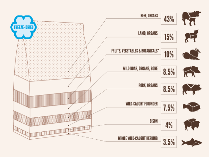 Beef, beef liver, lamb, flounder, wild boar, pork, bison, lamb liver, pork liver, whole herring, pea fiber, beef kidney, wild boar bone, whole pumpkin, collard greens, carrots, apples, lamb tripe, lamb kidney, wild boar liver, beef tripe, wild boar heart, salt, dried kelp, choline chloride, zinc proteinate, potassium chloride, manganese proteinate, copper proteinate, calcium pantothenate, vitamin E supplement, mixed tocopherols (preservative).Guaranteed Analysis